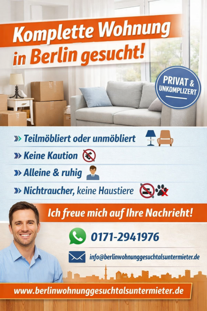 Ich suche eine Wohnung in Berlin zur Untermiete oder als Zwischenmiete, privat, ohne Makler, ohne Provision und möglichst ohne hohe Kaution. Meine Wohnungssuche richtet sich an private Vermieter, Hauptmieter oder Eigentümer, die ihre Wohnung unkompliziert und direkt vergeben möchten.